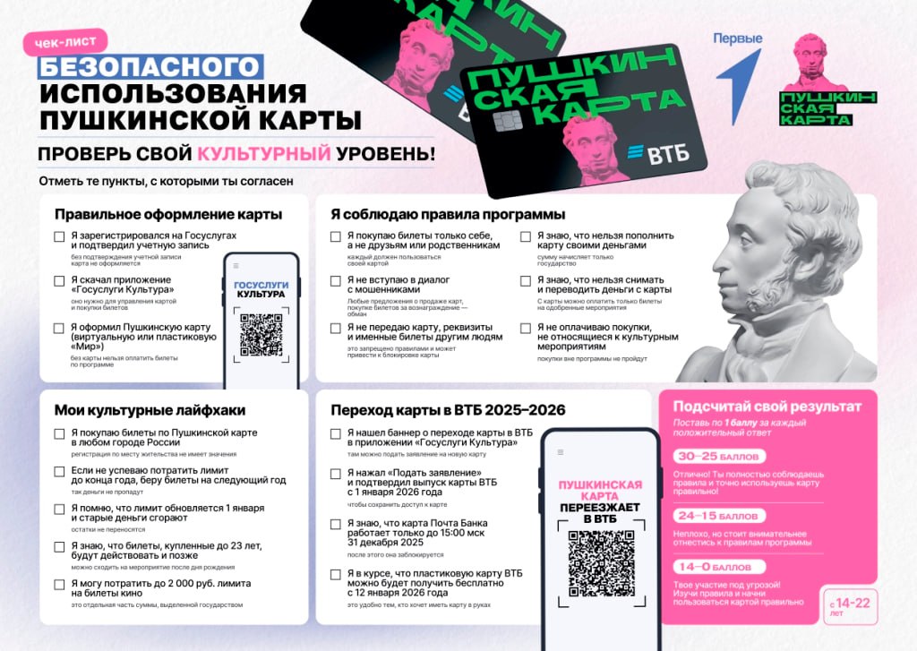 #ПушкинскаяКарта #ДвижениеПервых #КультураДляМолодежи #Безопасность #ГосуслугиКультура #ЧекЛист